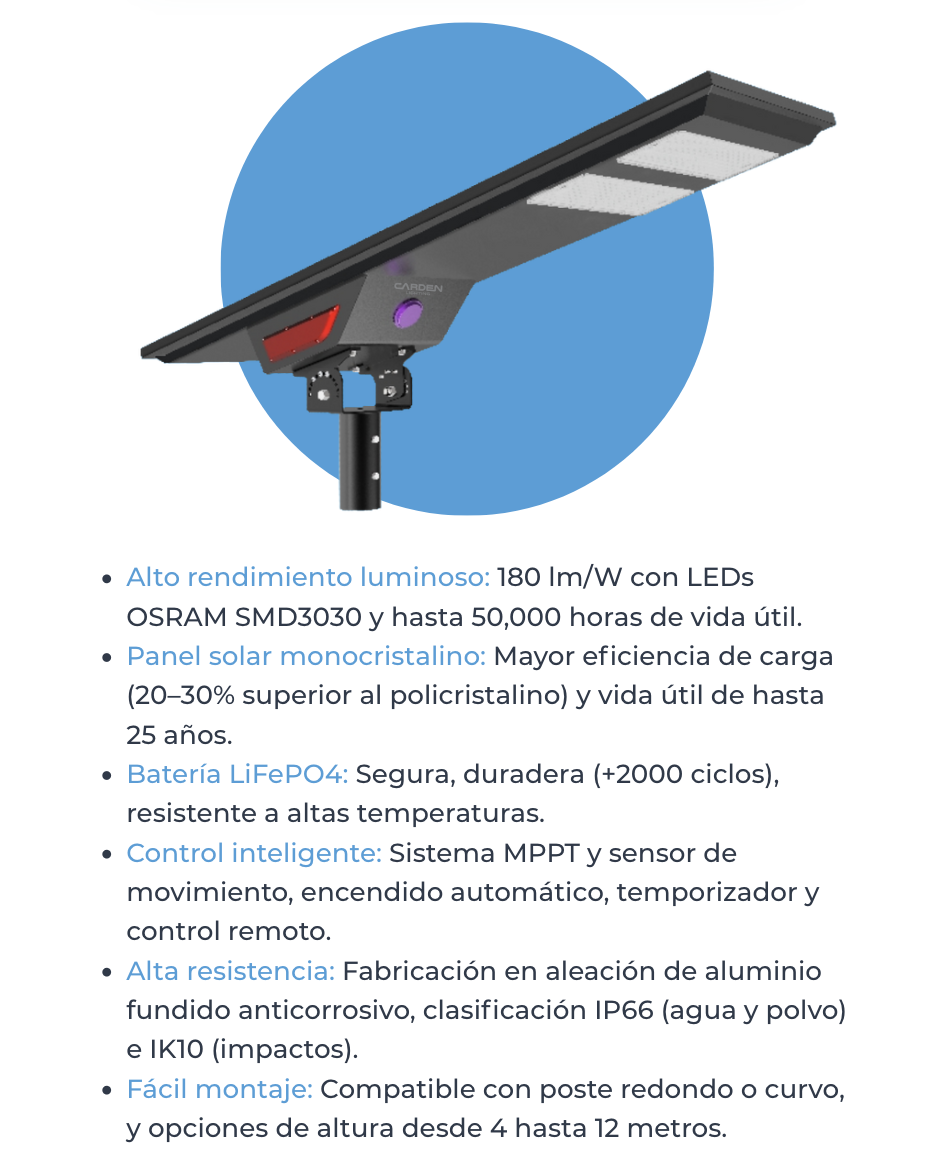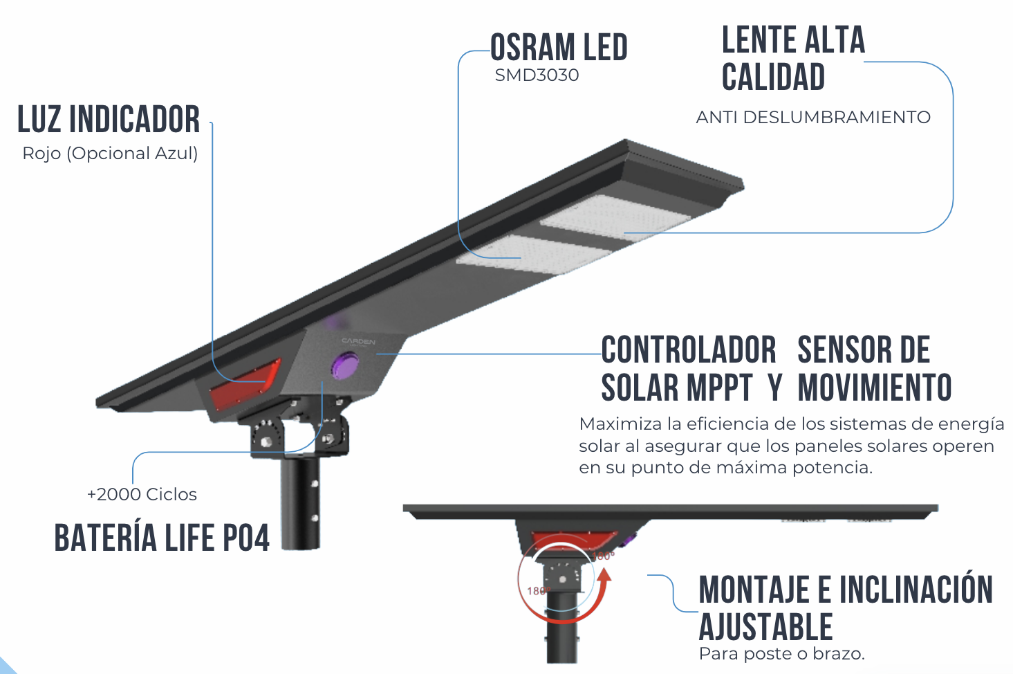Diseñada para aplicaciones urbanas, la luminaria SOLAR CLS8 LED ofrece altos niveles de iluminación y una variedad de potencias. Se trata de una luminaria solar equipada con panel solar Monocristalino y LED OSRAM SMD3030 de alta potencia, fabricada con aleación de aluminio fundido a presión y tecnología avanzada con un controlador MPPT que optimizan su eficiencia y autonomía o sensor de movimiento programable .